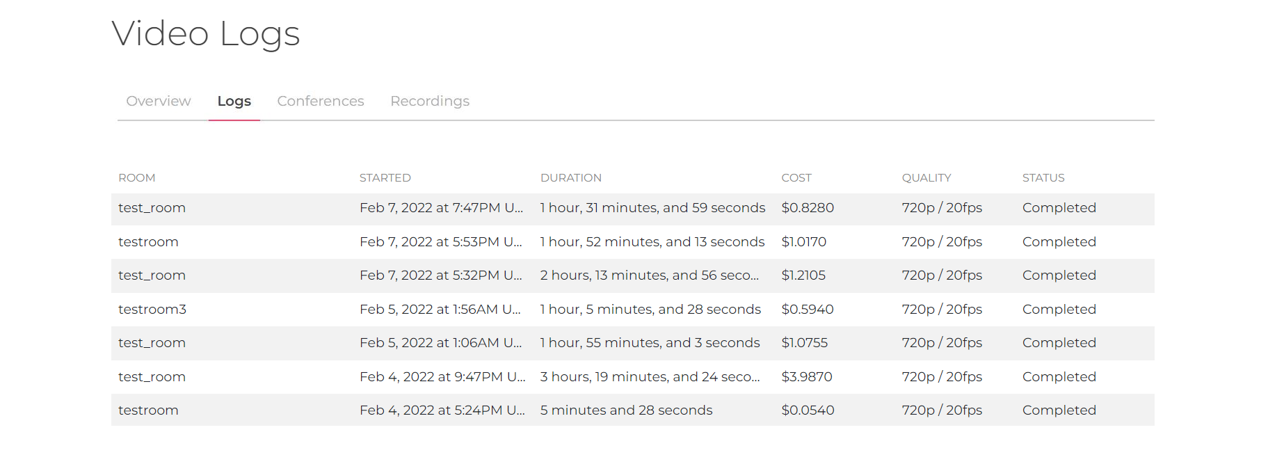 This tab is where you can find a detailed list of all video room sessions. This includes Video Conference rooms as well as API rooms.
